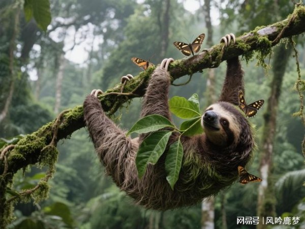 午后的阳光透过叶隙落在它脸上,它慢悠悠地伸出爪子梳理毛发,动作像电影慢镜头。突然有树懒蛾从它毛发里飞出来,绕着树叶跳了圈舞又落回去 —— 这些蛾子以树懒的粪便为食,成虫后会回到树懒身上产卵,形成独特的生态循环。看着它与世无争的模样,让人想把快节奏的生活按下暂停键。