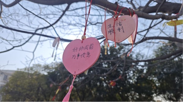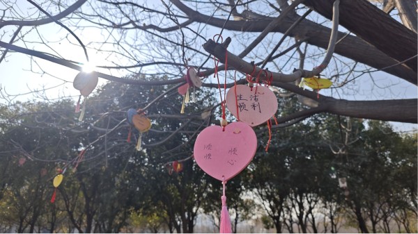 来自软件工程专业的同学分享道:“今天走在校园小道上,发现校园树枝上挂了很多心牌,上边写了一些美好幸福生活的祝福话语,在微风中轻轻摇曳,那一刻,心情瞬间被点亮,原来小确幸就在身边。”