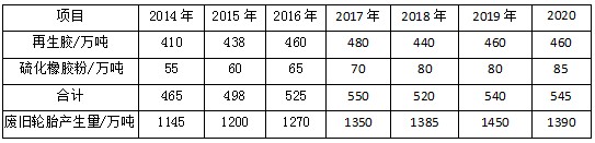 2014-2020年中国胶粉、再生胶、废轮胎产量见下表。