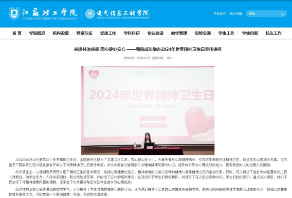 2024年10月10日是第33个世界精神卫生日,全国宣传主题为“共建共治共享,同心健心安心”。为宣传普及心理健康知识,引导学生积极关注精神卫生,促进学生心理成长发展,电气信息工程学院在图书馆北报告厅举办了世界精神卫生日宣传讲座。此次讲座旨在增强学生对精神健康问题的认识,提升他们应对心理挑战的能力,营造积极向上的校园文化氛围。