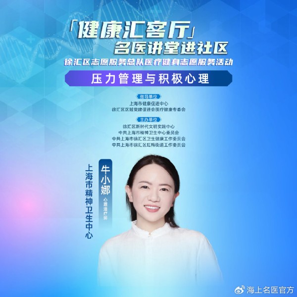 我们要从正确认识压力情绪开始,识别它的表现,从自我关怀和灵活应对开始,有效调整压力情绪问题。“健康汇客厅·名医讲堂进社区”将于10月15日下午,走进虹梅街道党群服务中心,举办压力管理与积极心理相关知识宣教专场科普讲座。讲座邀请上海市精神卫生中心心理治疗师牛小娜医生为大家带来压力管理和积极心理相关科普课程,增强群众对压力情绪等相关知识的了解,有效应对,共创平和、充满信心的好生活。