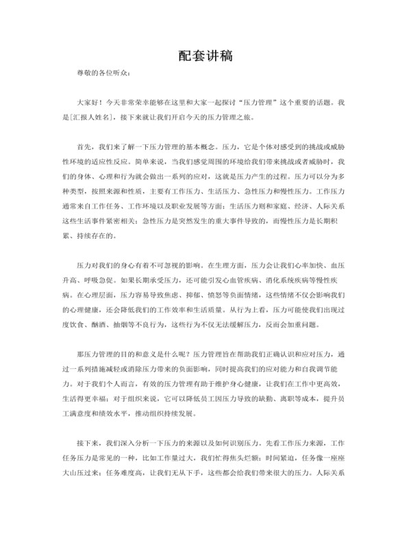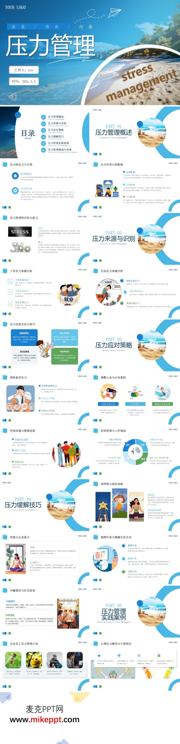 这是一套专为压力管理培训设计的PPT动态课件模板,共31页。课件内容丰富,涵盖了压力管理的目的与意义、压力应对技巧、实践案例以及挑战与对策等多个方面,旨在帮助培训对象全面了解压力管理的重要性,并掌握有效的应对方法。 在现代社会,压力已成为人们生活中不可避免的一部分。压力管理作为一个综合性过程,涉及对压力源的识别、对压力影响的评估以及采取积极的应对方式。本课件首先从压力的定义入手,深入探讨了压力对日常生活的影响,如情绪波动、工作效率下降、身体健康受损等。通过这些分析,课件自然地引入了压力管理的概念,强调其在现代生活中的重要性。 在应对压力方面,课件详细阐述了来自工作和日常生活中的常见压力源,并提供了针对性的应对策略。这些策略包括理性面对压力、调整心态、情绪宣泄以及合理规划工作等。这些方法旨在帮助人们从心理和行为两个层面积极应对压力,从而减轻压力对身心的负面影响。 此外,课件还介绍了多种缓解压力的小技巧。例如,通过深呼吸和肌肉放松训练来缓解身体紧张,利用冥想来平静心灵,保持规律作息和健康生活方式来增强身体抵抗力。同时,课件还建议人们找到自己的兴趣爱好,多参加社交活动,通过丰富的生活体验来分散对压力的注意力。 在实践案例部分,课件分享了几个分别针对企业员工、校园学生和个人的压力管理建议。这些案例展示了压力管理在不同场景中的应用,为培训对象提供了具体的参考。最后,课件总结了压力管理面临的挑战与对策,指出提升自我抗压能力、寻求专业支持与帮助以及构建良好的社交支持网络是应对压力的关键。 通过系统的学习和实践,这套课件旨在帮助人们更好地管理压力,提升生活质量,从而在快节奏的现代生活中保持身心健康。