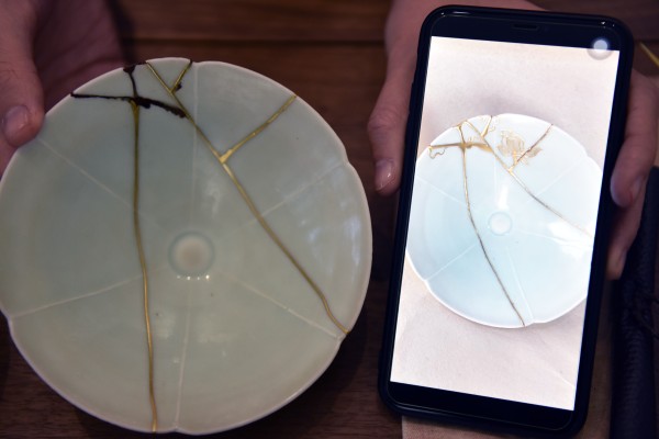 金缮修复,其实就是用天然生漆,把破碎的瓷器、玉器、紫砂、木器、玻璃等器物黏合后,再在表面涂上金粉,让破碎的器物焕然一新。这种过去流行于宫廷中的修复技艺,后来随着瓷器的繁荣发展,逐渐没落。近年来,由于茶文化的普及以及收藏热的兴起,金缮修复技艺又逐渐被大众认可。图为陈画展示一件用大漆做的果盘。