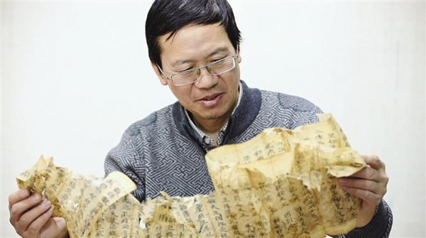 采访中,张文军向记者展示了他最近修复的一册清代道光年间的经折装书卷。由于年代久远,致损因素太过复杂,上面不仅有许多裂痕,书册个别地方已朽为纸泥。他向记者解释说,“一般来说,纸制品文献的含水率在7%左右,但由于北方气候干燥,这里的文献含水率一般在3%左右。水分散失过多,植物纤维自身就会干裂分解,这也是北方纸质文献大多干裂缺损的原因。”