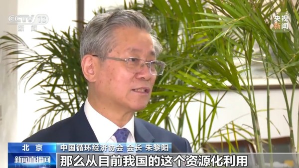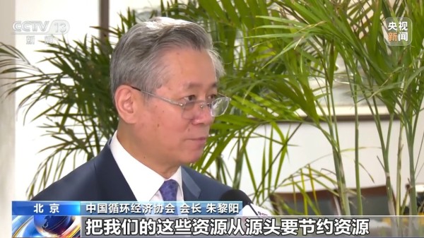 中国循环经济协会会长 朱黎阳:在我们产品全生命周期中,把我们的这些资源从源头要节约资源,提高资源的利用效率,生产过程中要减少我们废弃物的污染的排放,末端我们要把它资源化,通过循环经济发展的方式把它资源化利用起来。