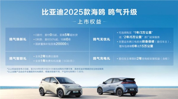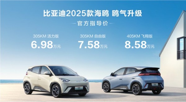 8月1日,比亚迪2025款海鸥正式上市,售价6.98万元-8.58万元。通过12项升级,拥有16项全系标配的海鸥助力更多用户开启多元绿色出行生活。作为“新一代主流代步车”,海鸥仅用16个月的时间,累计销量就超过50万辆,成为国内最快达成这一成就的纯电轿车和A00级车型。升级不加价,现在购车的用户,更可享包括金融服务、置换补贴、网络流量等在内的多重权益大礼。