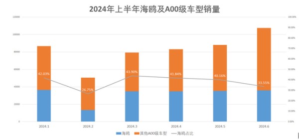 在海鸥的带动下,国内A00级市场份额从2023年海鸥上市初期的3.3%稳步增长至2024年6月的5%,海鸥在细分市场的单月占比最高达43.9%。可以说,海鸥打破了此前A00级市场低价低质、同质化严重、竞争乏力的市场困局,引领细分市场迈入精品代步车时代。