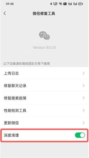 2、在微信修复工具中,开启最下方的【深度清理】功能(该功能正在灰度测试);