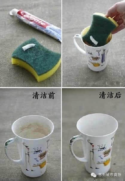 方法:一点牙膏轻松除去!牙膏中有细微颗粒帮助摩擦污垢!