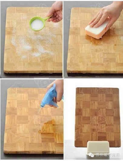 方法:先用洗洁精和水将案板清洗干净,在案板上撒一点盐,反复擦洗30秒左右,用清水洗净。再用白醋和水1:2的比例倒入喷壶中,喷在案板表面,不用再清洗,自然风干就可以了。白醋有杀菌消毒的作用,非常实用。