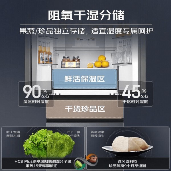 MRA低氧窖藏养鲜系统在冷藏区内创造出一个接近休眠状态的储藏环境,有效延缓果蔬的呼吸节奏。动态除菌净味装置持续监测箱内空气,通过循环释放的负离子主动分解异味分子,维持储藏环境的清新纯净。 这些协同运作的保鲜科技共同构筑起食材保护的立体防线。