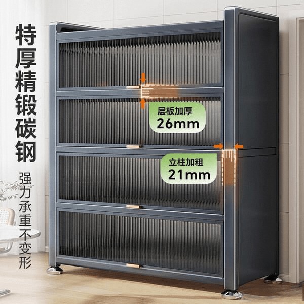 这款JEKO&JEKO厨房置物架真的是让厨房收纳变得轻松又高效的好帮手。它拥有四层设计,不仅提供了充足的储物空间,帮助你将碗碟、电饭煲、汤锅等各类厨房用品有序放置,更是巧妙地节省了厨房的空间。摆在墙角刚刚好,确保即使在狭小的环境中也不会显得拥挤。透明的可视门设计,让你随时可以快速查找所需物品,再也不怕翻箱倒柜找不到碗筷了。
