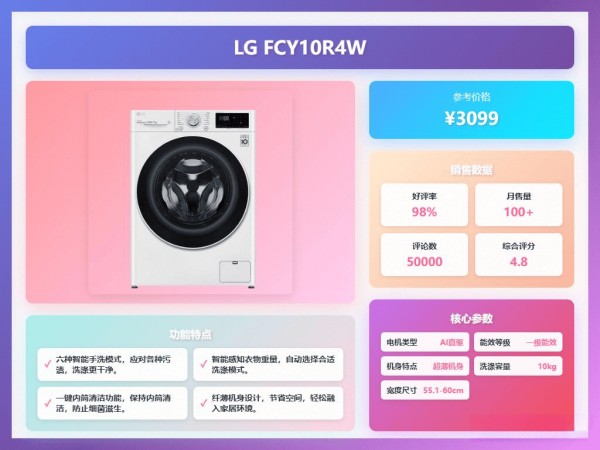 LG在家电领域以创新技术和精湛工艺著称,致力于为用户打造更智能、便捷的生活体验。其洗衣机产品融合了前沿科技,在洁净、护衣、节能等方面表现出色,赢得了广泛好评。