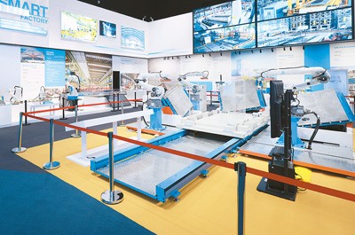在中国建筑科技展“助力中国建造”展区一角,机械臂正在搬运建筑材料。