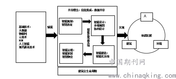 根据上文所述的有关智能建筑的概念及内涵,在结合建筑全生命周期的基础上综合全面的分析智能建筑。新的基础性技术赋予了建筑智能化,围绕建筑规划、设计、建造、运维等阶段,以智能化集成系统为核心,形成一个集成的信息平台,运用共享理念使信息集成和数据共享,实现人、建筑、环境的和谐发展。据此,本文构建了智能建筑的运行机制模型,如图3所示。