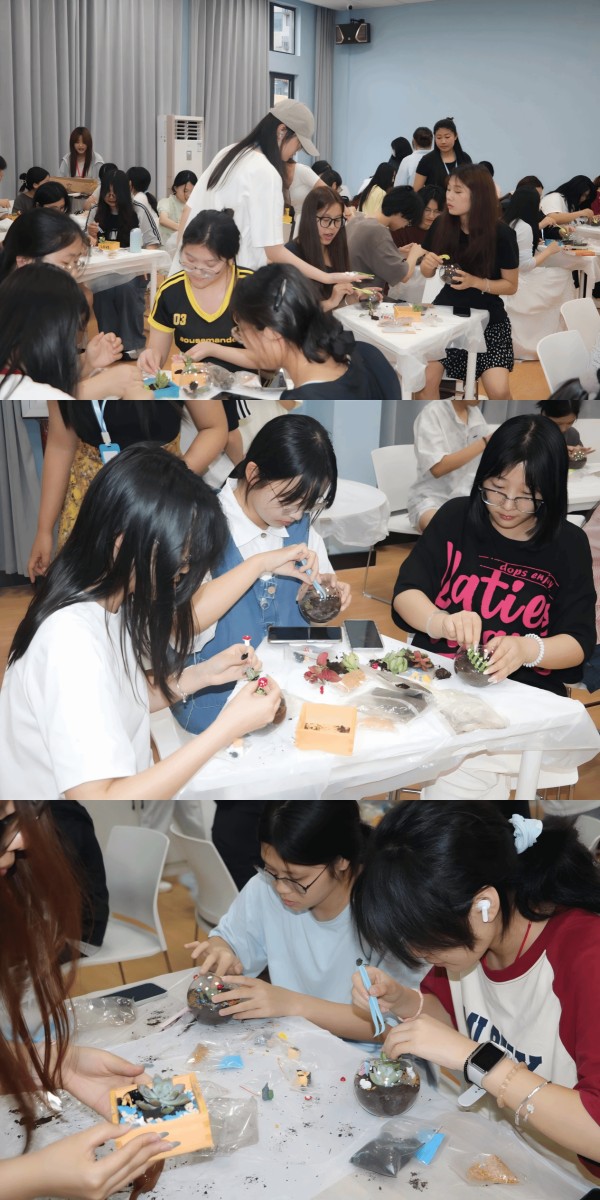 伴随轻快的音乐,董维老师带领同学们通过调节呼吸和节奏互动激活身体,帮助同学们在非言语的互动中卸下心理防御,进入专注而开放的状态。紧接着,工作人员为每位同学分发了制作材料,包括多肉植物、苔藓、精致摆件以及DIY容器。在轻音乐的氛围中,同学们充分发挥创意,将不同元素巧妙组合,打造出各具特色的“心灵花园”。