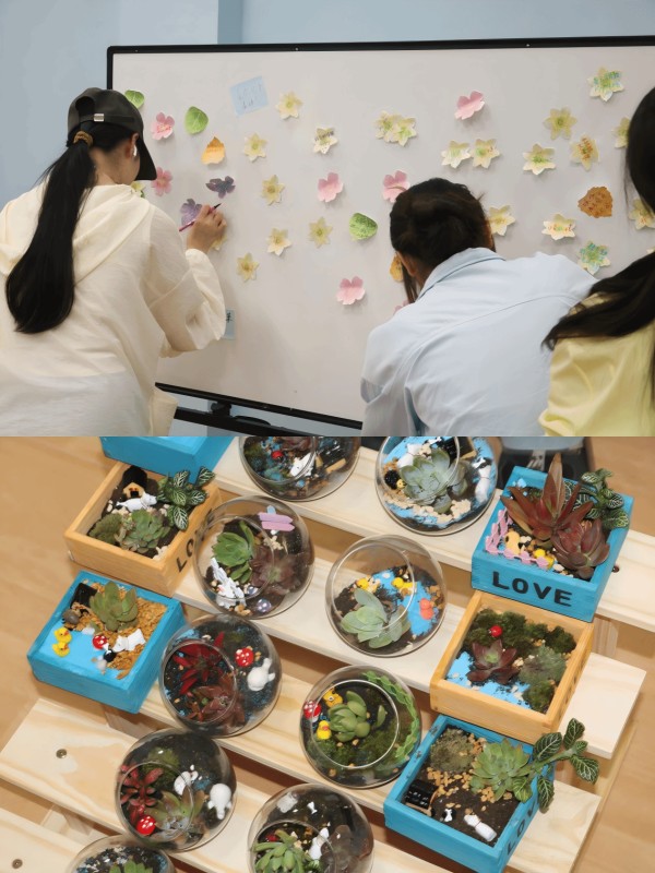 活动进入尾声,同学们写下心灵寄语,形成一片“心灵树洞”,并决定将自己精心制作的微景观带回宿舍继续养护,延续这份自然的疗愈力量。