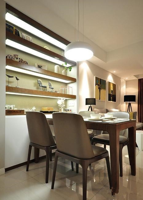 餐厅的一侧,设计了置物架,不但可以放一些工艺品,也可以放些红酒及茶具。