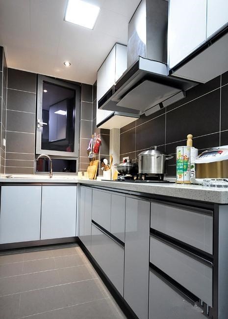 厨房以深色瓷砖为墙面,有耐脏的优点。