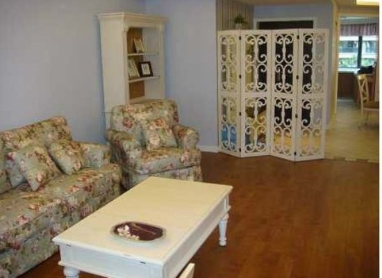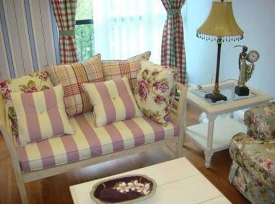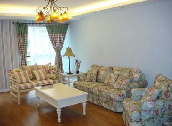 蓝白相间的墙纸,花朵沙发,地中海的风情油然而生。