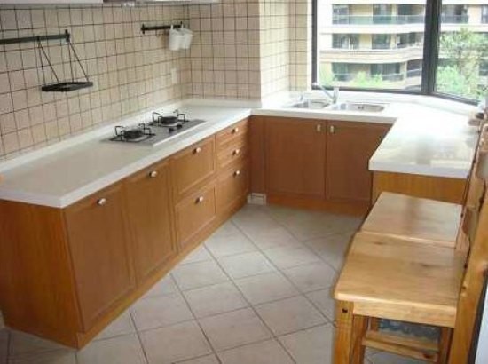 厨房,很干净整洁,还没有投入使用,也还需要添置些用品。凳子和橱柜都是原木的。