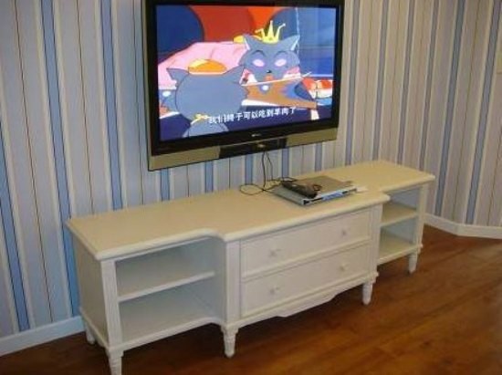 壁挂电视,白色电视柜,空空的,等待主人摆放东西进去。