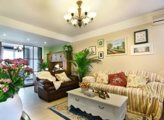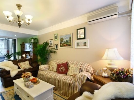 客厅以柔和的淡黄色调为底色,富有田园特色的沙发和充满暖感的羊毛毯顿时让人感觉暖意融融。