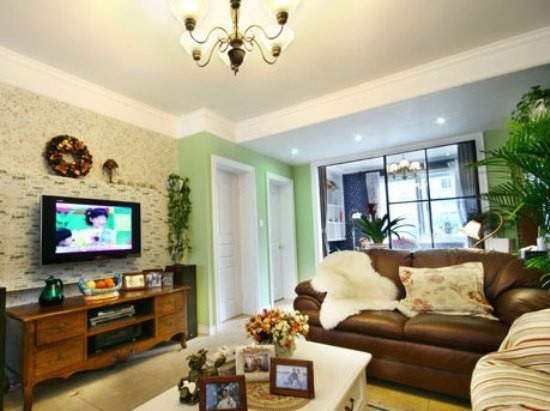 电视背景墙是客厅的一个亮点,马赛克贴出的小碎花搭配淡绿色温馨花纹很有一种节日的喜庆。