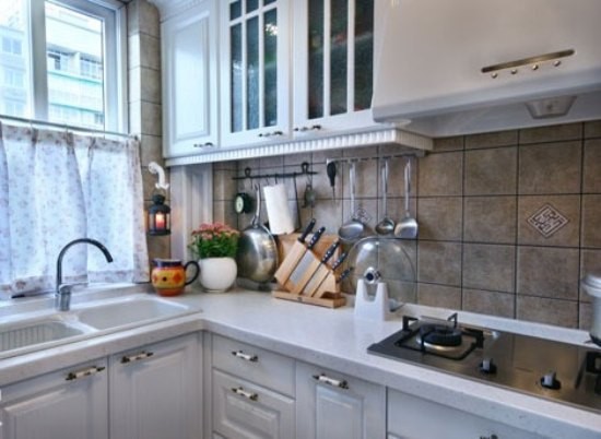 厨房,打造美食的地方,以白色调为主,窗户上依然是业主钟爱的碎花窗帘。