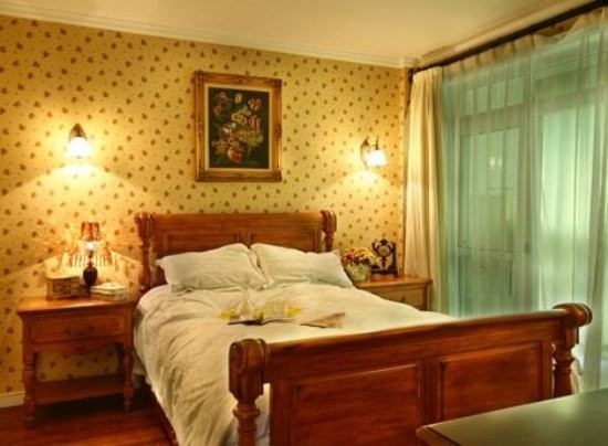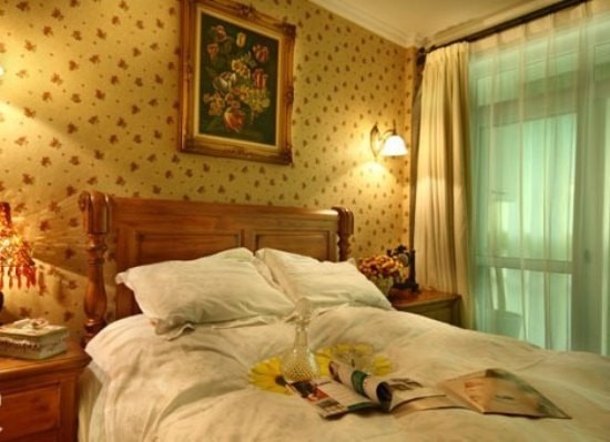 装饰画设置为装饰花静物图,两盏壁灯投射的光线为空间增色不少。