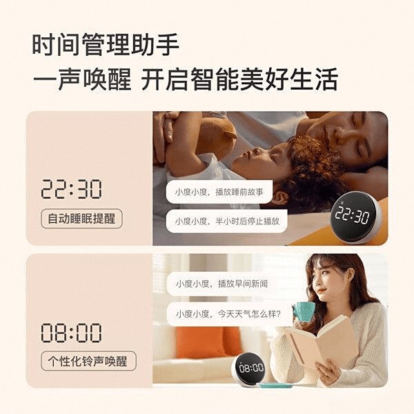 这款小度智能闹钟音箱不仅是一款简单的闹钟,更是你生活中不可或缺的智能助手。它搭载了全频扬声器,提供高保真的音质,让早晨的闹铃声清晰而动听,再加上丰富的影音资源,随时随地都能播放你喜欢的音乐或故事,为你的生活增添乐趣。特别适合有孩子的家庭,能够作为早教机播放各种寓教于乐的故事,帮助孩子在愉悦的环境中学习与成长。