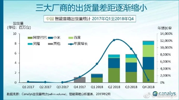 就在近日知名市场调研机构 Canalys 发布了《2018 年第四季度中国智能音箱报告》,报告显示在过去的2018年第四季度,国内智能音箱的出货量迎来一个爆发期。在本季国内智能音箱出货量高通860万台以上,占整体年度出货量的40%。其中阿里的出货量最大占据约31%的市场份额,小米与百度不相上下。