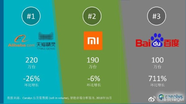 Canalys 同时还预测2019年国内智能音箱的出货量将达到2960万台左右,看来这是一个非常大的市场。目前苹果、华为等已经全面进入这个市场,未来还能不能保持阿里、小米、百度三强的地位目前还真不好说。