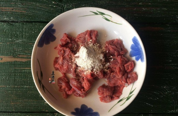 牛肉切薄片洒少许黑胡椒粉,并放入一匙淀粉抓匀【地瓜粉、生粉均可】