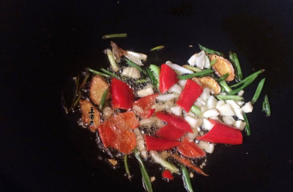 锅再倒入少许油,先煸出姜油再放入葱、蒜、辣椒一起爆香