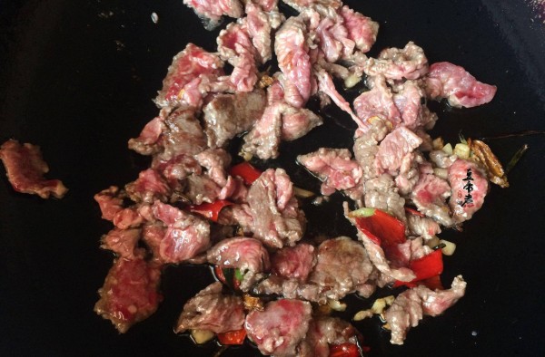 然后放入牛肉片爆炒,一开始放入锅中的时候不要马上翻动。这样才不会粘锅