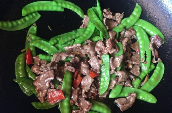 在牛肉爆炒熟的时候倒入炒过的荷兰豆,并做调味然后就能出锅了