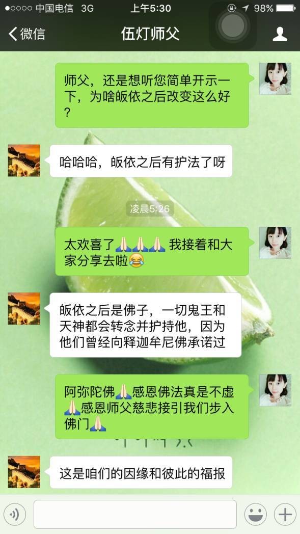 子赞已经皈依一年半了,记得皈依之前,晚上睡觉的时候经常会吓哭,就像做噩梦一样,自从皈依之后发现晚上睡觉时竟然不哭了!于是给师父发微信请教师父是怎么回事。师父慈悲的为我开示了(如下图)。有一位子盖小居士(比子赞还要小四五个月的一名居士)经香山寺义香法师的慈悲接引也皈依了佛门。拒义香法师说,子盖睡觉时也经常啼哭,皈依后也不哭了。阿弥陀佛!真的有护法神在护持他们!