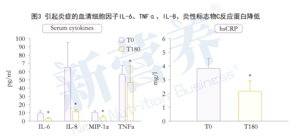 与此同时,引起炎症的血清细胞因子IL-6、TNFα、IL-8,以及炎性标志物C反应蛋白显著降低,这意味着因衰老而引起的慢性炎症的生物指标得到了改善。(图3)