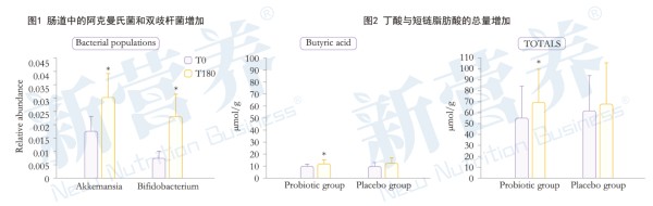为了深入了解益生菌对健康老年人生活质量的影响,围绕97名年龄在65岁以上的健康老年人展开了一项双盲安慰剂对照实验。实验组每人每天食用50亿CFU的MIX SYNBIO®益生菌,在长达6个月的实验期内,通过观察肠道菌群组成与短链脂肪酸构成,测量主要炎症生物标志物C反应蛋白和血清因子IL-6、TNFα、IL-8,以及营养评价表,研究人员发现,与安慰剂组相比,实验组得到的结果是调节了老年人正常肠道菌群组成,肠道中的阿克曼氏菌和双歧杆菌显著增加,同时丁酸与短链脂肪酸的总量都有所增加,这些短链脂肪酸从维护肠道屏障的完整性、防止炎症等多个角度支持健康老龄化。(图1、图2)