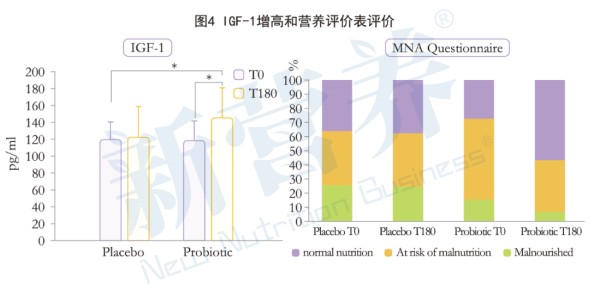更为重要的是,与肌肉完整性密切相关的IGF-1显著增高,通过营养评价表的评价,与对照组相比食用益生菌降低了实验组的肌少症和营养不良风险。(图4)