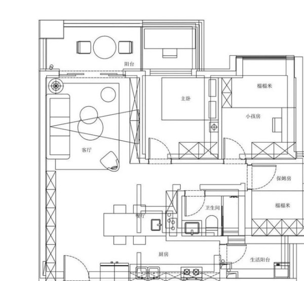 原户型是 82㎡传统三室两厅,空间划分得格外狭窄,阳台面积占比过大,且没有合理利用,造成了明显的空间浪费,尤其是公共区域狭长、厨房采光差。