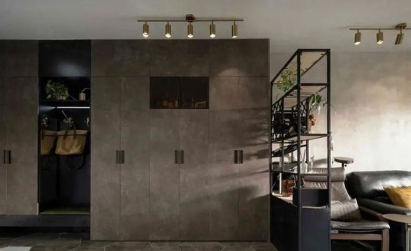 推开大门,入户处的灰色整体衣柜格外吸睛 —— 衣柜采用灰色大理石纹元素,既添了时尚感,又打破了原空间的狭长构图,从视觉上拉伸了入户区域,进门第一印象就很清爽。