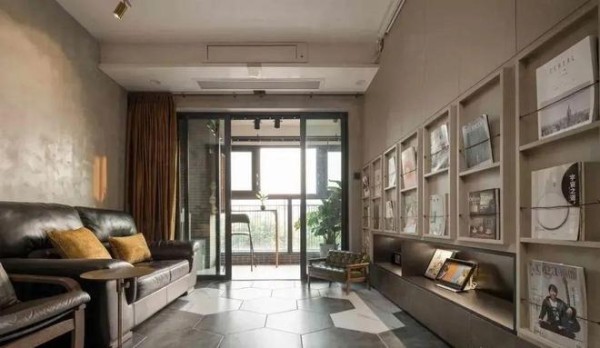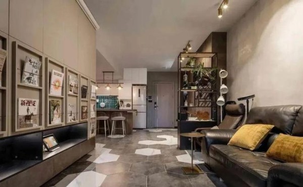 地砖巧思:地面铺灰色大理石六角形地砖,灵动活泼的造型打破了空间进深过长的问题,视觉上更显开阔,避免了工业风常见的压抑感。个性影视墙:影视墙设计超有巧思 —— 以业主的职业相关杂志为背景装饰,既增加了时尚感,又兼具储物与展示功能,既凸显了业主的职业特性,又透着小资生活的情调;还特意为业主儿子摆放了专属小沙发,开辟出独立小空间,从小培养孩子的独立意识。