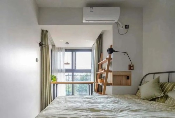 功能延伸:借阳台空间增设的办公区,与卧室相连却可通过窗帘分隔,既能保证办公时的安静独立,又不用额外占用其他空间;书桌左侧的书柜,方便存放书籍与办公用品,实用又整洁。