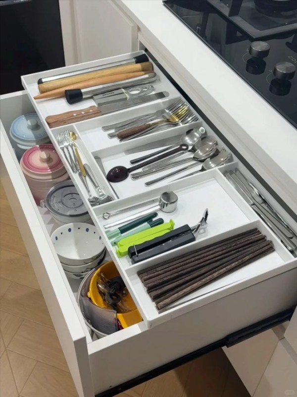 千万不要选择深柜当做厨房收纳,深柜的话一般会浪费厨房的上层空间,而抽屉绝对不会浪费厨房的收纳空间,超实用!
