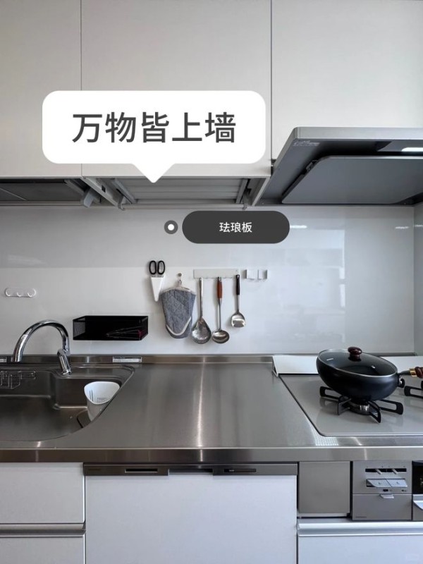 在设计厨房灶台时,不妨在厨房灶台后方安装一块珐琅板,日常让清洁打扫更加方便,同时还可以利用珐琅板的磁吸原理,磁吸一些小工具,拿取更方便。