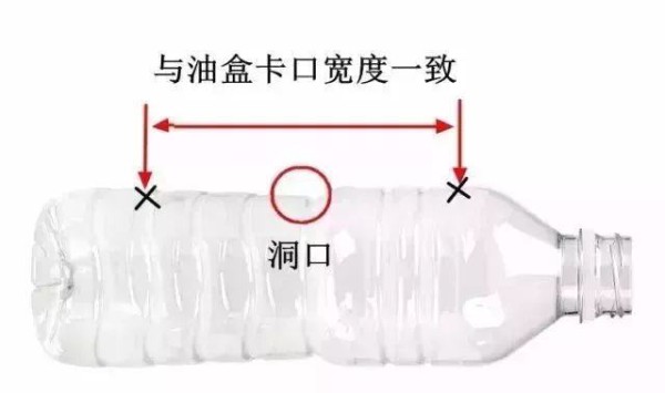 接着,要根据油烟机上油盒挂钩的位置,来确定塑料瓶相应卡口的裁剪位置。先用卷尺量好对应的宽度,以圆洞口为中心,确定两侧挂钩卡口的位置,然后用笔画上记号。之后,用剪刀在两侧各剪一个缝隙,这样就能使塑料瓶固定在油烟机挂钩上了。