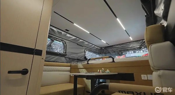 在车身高度方面,探索家星际在降顶状态下车高仅2.2米,升顶后生活舱净高2米,并配备了270°观景窗与40寸投影幕布,不仅能轻松通过大部分城市地库,露营时还能沉浸式感受自然风景。
