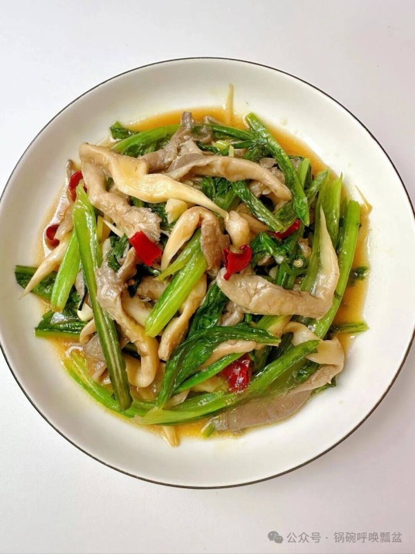 3️⃣倒入蘑菇翻炒至变软,放入油麦菜继续翻炒4️⃣适量生抽、盐翻炒均匀即可